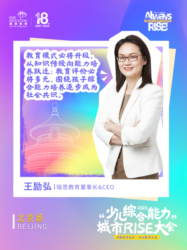 面对这种转变,瑞思教育在少儿综合能力培养赛道18年的深耕实践,赋予了他们深度观察的能力。王励弘在大会致辞中提到:“瑞思十八年的发展历程,正是中国素质教育从萌芽走向蓬勃的缩影。”她回忆,2007年瑞思教育刚刚进入中国时,综合能力培养还是一个很先进的概念。走过18年,当今天的我们再提及综合能力时,它的内涵已经从单纯的基础知识、学科能力升格到个人素养、社会素养,囊括了沟通协作、解决问题、终身学习等等更为多元、抽象的能力要素。