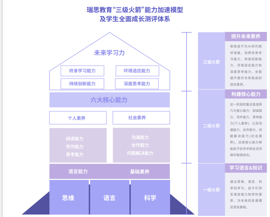 细分来看,瑞思教育“三级火箭”能力加速模型,分为三层:底层“一级火箭”为学习语言及知识,夯实语言能力和学科素养,为未来的发展奠定基础;中间层“二级火箭”包含阅读能力、写作能力、思考能力、沟通能力、合作能力和问题解决能力六大核心能力。其中,前三者属于“个人素养”,让孩子能够“向内求”,提升自我认知和知识储备,后三者则属于“社会素养”,让孩子“向外求”,习得人际链接和社会协作技能。六大核心能力协同发展、共同提升,才能更好地帮助孩子在学术和社交环境中获得成功。以这六大核心能力为中坚要素,结合由思维、语言和科学锻炼得来的语言能力和基础素养,孩子们才能进一步去发展顶层“三级火箭”能力——未来学习力,为AI时代的到来做足准备。